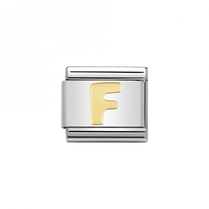 Nomination Original Charm for Composable Classic Bracelet with Alphabet Letter F in stainless steel and bonded yellow gold. Available Charm versions: A-Z. Made in Italy. The perfect birthday gift.