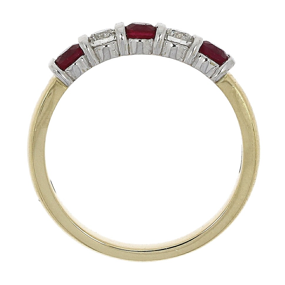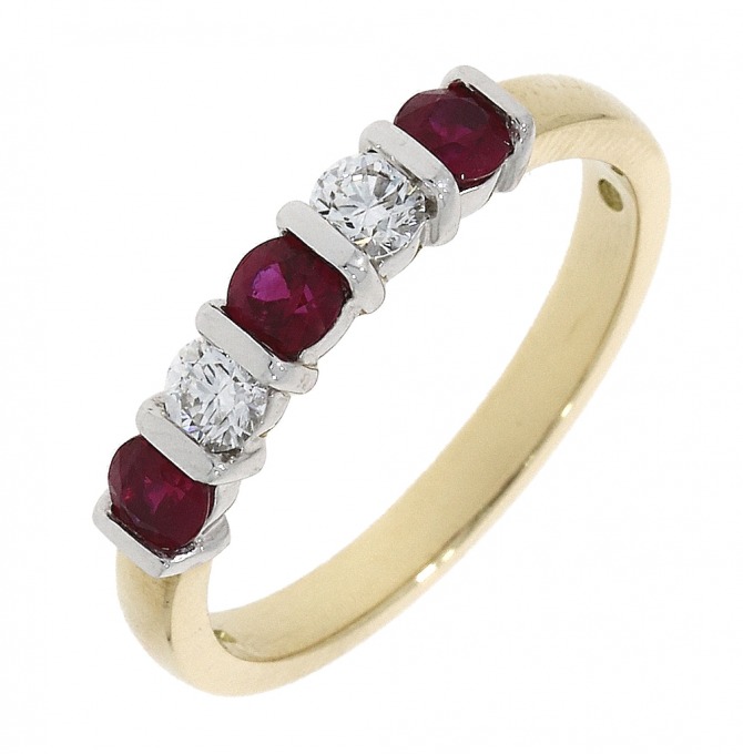 18ct gold with diamonds (0.24ct) and ruby (0.53ct) which are bar set on this stunning eternity ring. Perfect for a lady with a July Birthday!