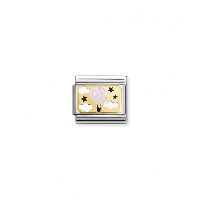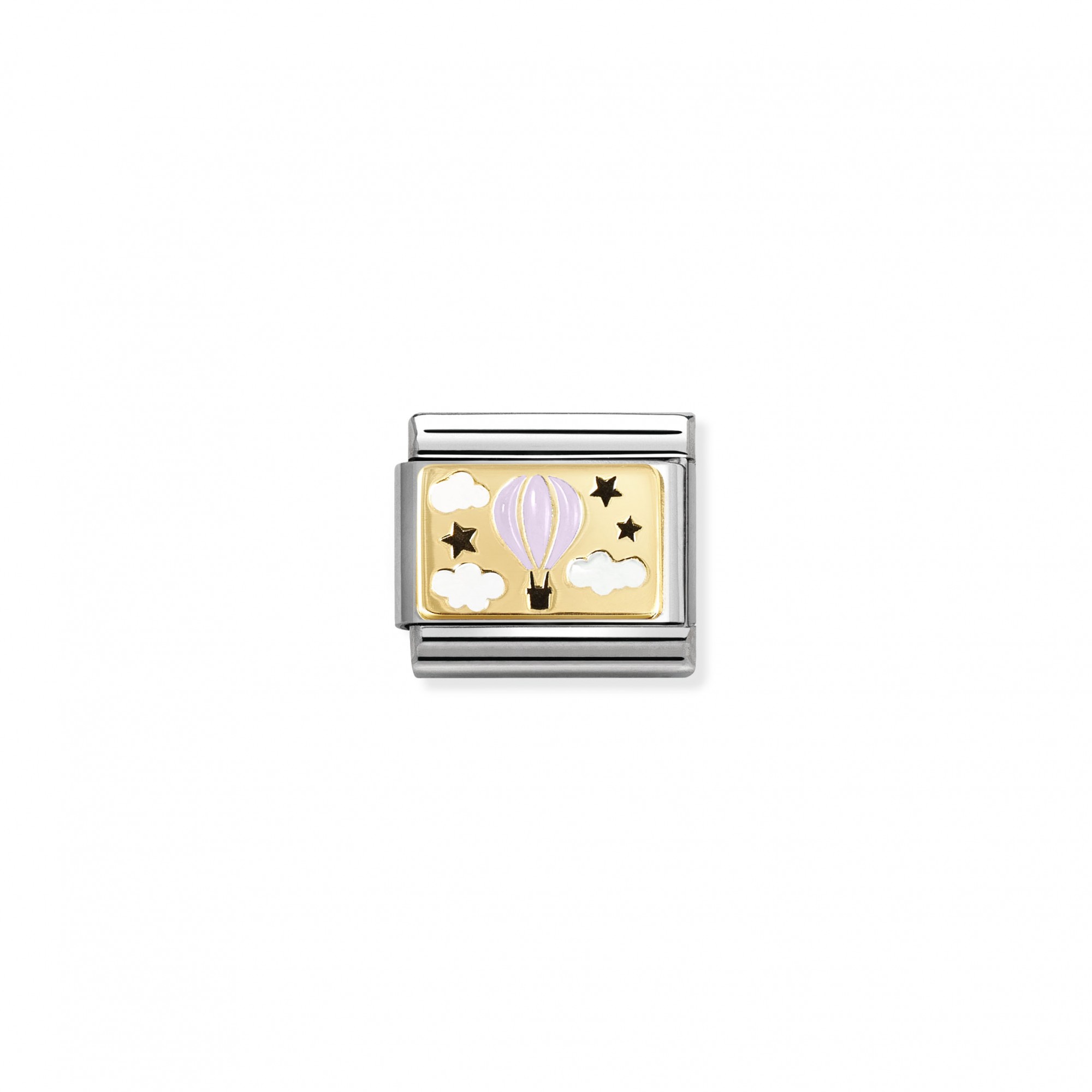 Nomination Original Charm for Classic Composable Bracelet with Hot-Air Balloon symbol in stainless steel, with bonded 18ct yellow gold and black, pink and white enamel. Made in Italy. The perfect jewel for a true dreamer.