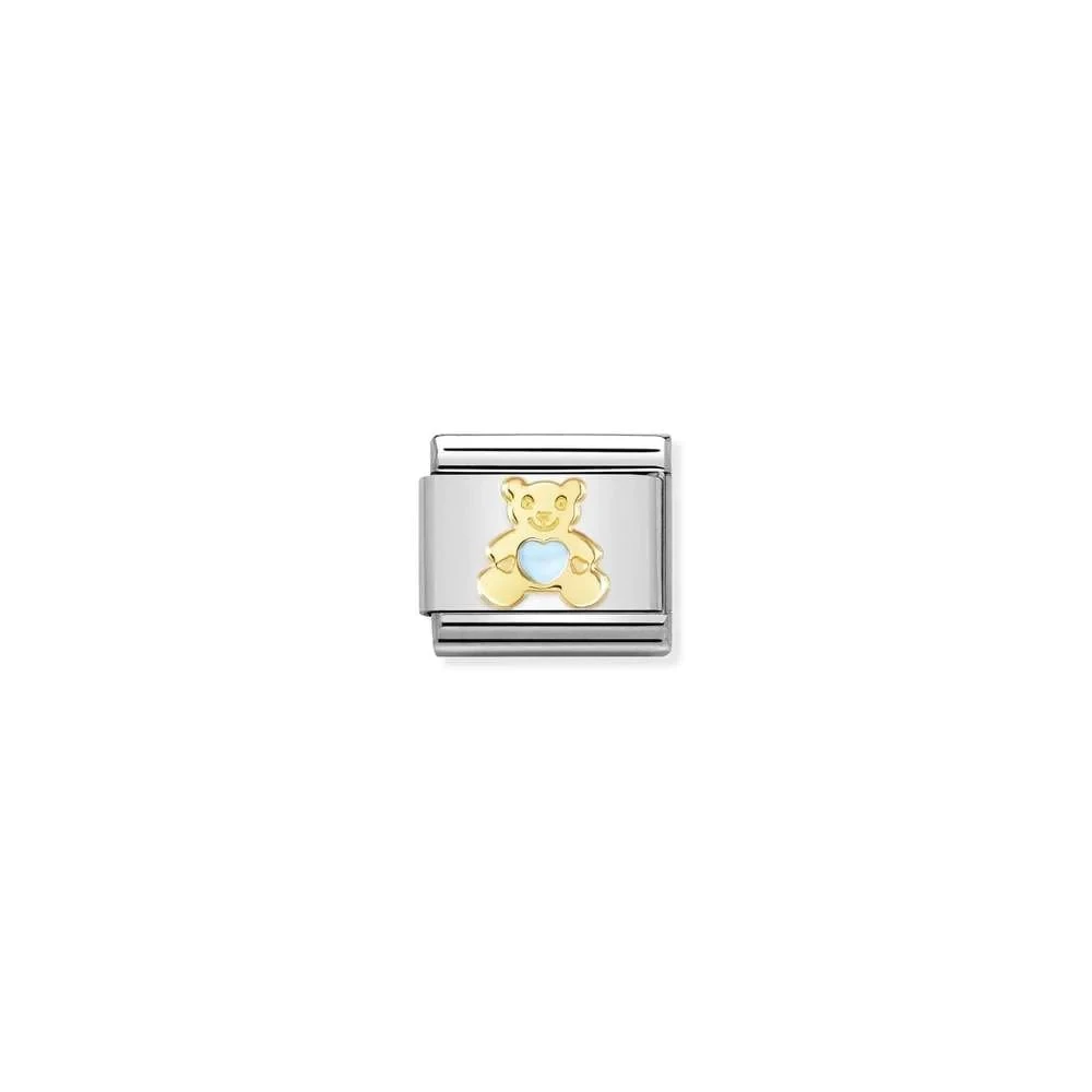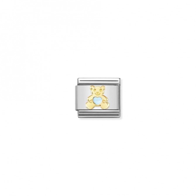 Original Nomination Link for Composable Classic Bracelets in stainless steel and 18K gold with coloured enamel Light Blue Bear symbol. Made in Italy. Do you still sleep with your teddy bear? This is the Link for you!