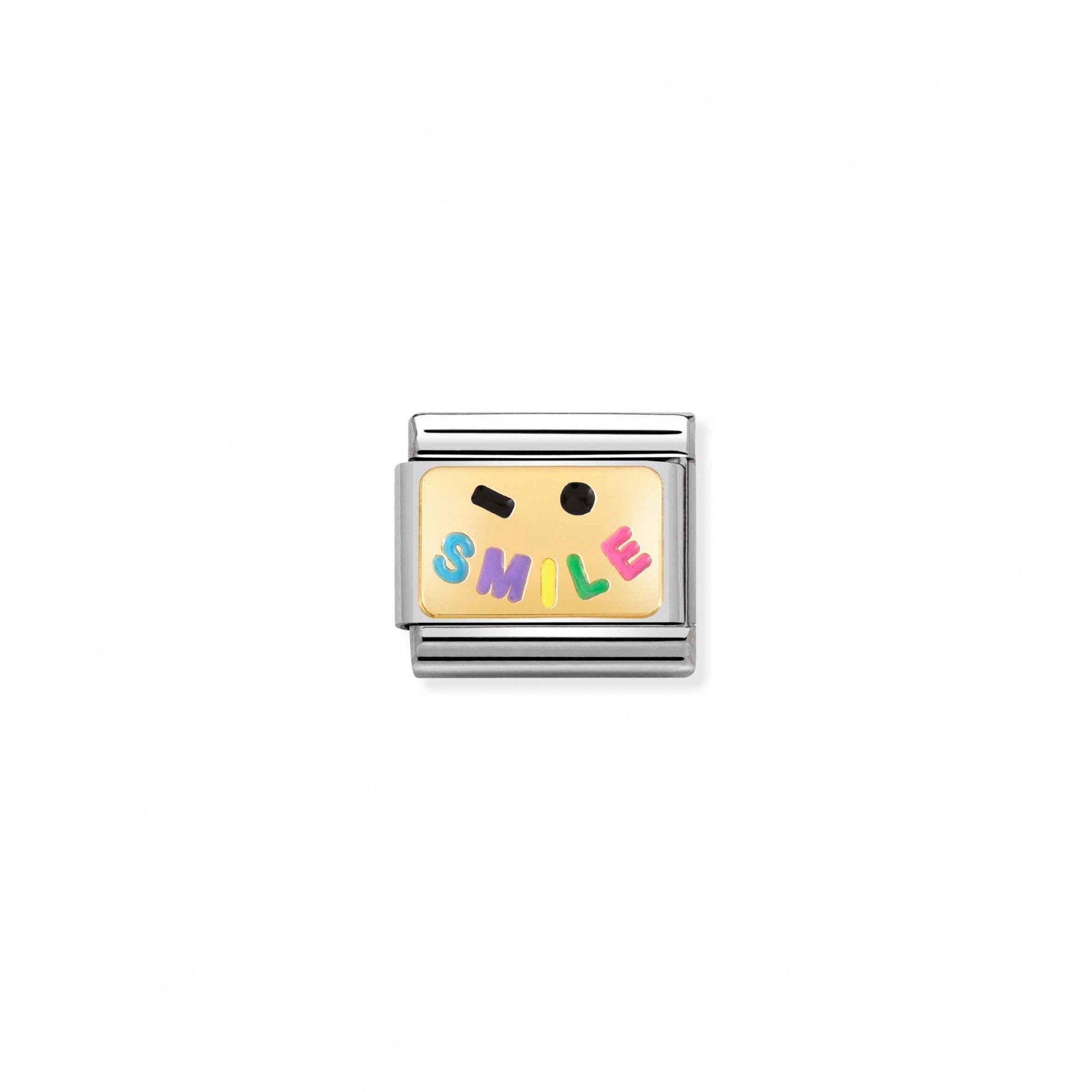 Original Nomination Classic Link in stainless steel and 18K yellow gold with coloured enamel with symbol made up of a wink and SMILE text. Made in Italy. There are lots of ways to share a smile but this colourful and precious Link might just be the best!