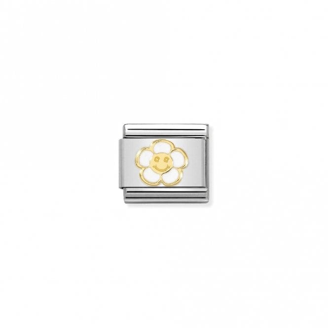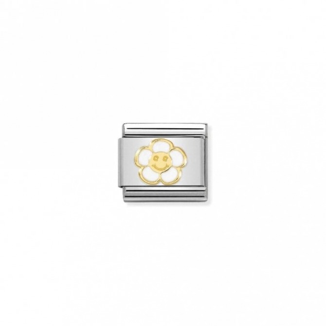 Original Nomination Link for Composable Classic Bracelets in stainless steel and yellow gold and White enamel with Flower with Smile symbol. Made in Italy. This Link is the perfect way to capture those easy and carefree days of summer to keep with you through winter.