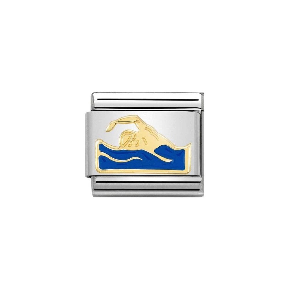 Charm for the original Composable Classic bracelet in stainless steel, bonded yellow gold and enamel. Made in Italy. A great Charm for anyone who loves swimming.