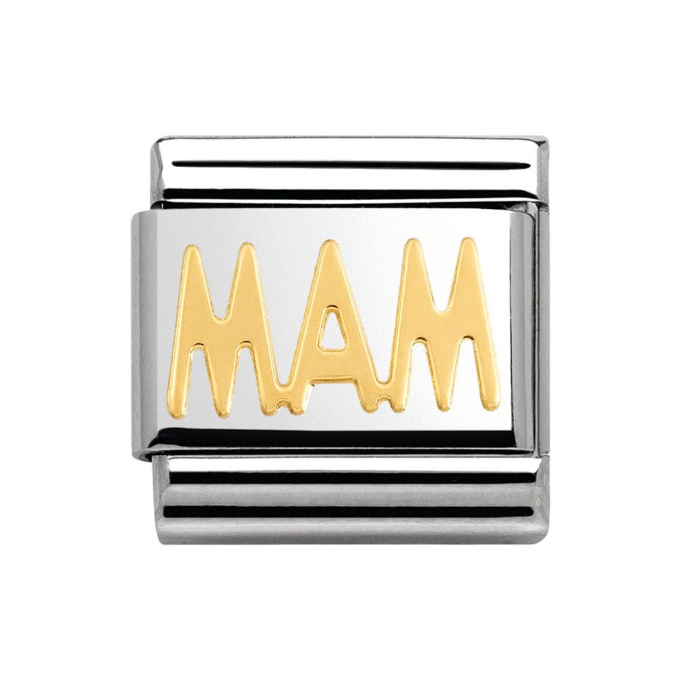 Original Charm for Composable Classic Nomination Bracelet with MAM writing in stainless steel and bonded yellow gold. Available in several Writing symbols. Made in Italy. Add a special Charm to your bracelet. The perfect Mother's Day gift.