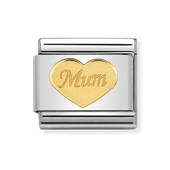 Charm for the Original Composable Classic bracelet with Heart and “Mum” engraved in stainless steel and bonded yellow gold. There are many family-themed Charms to choose from. Made in Italy. Give this Charm to your Mum to show her just how much she means to you. The perfect Mother's Day gift.