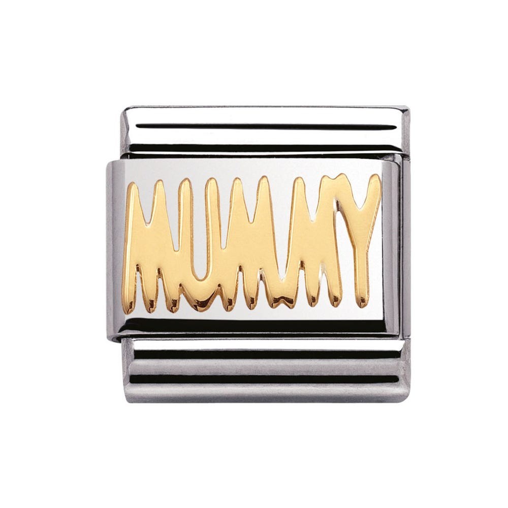 Original Charm for Composable Classic Nomination Bracelet with MUMMY writing in stainless steel and bonded yellow gold. Available in several Writing symbols. Made in Italy. Show Mum just how much you love her! The perfect Mother's Day gift.
