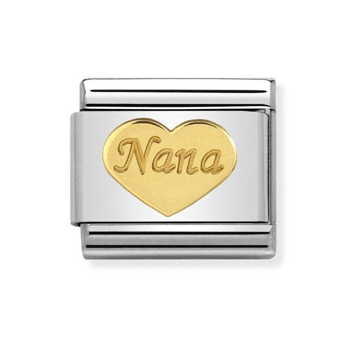 Original Charm for the Composable Classic bracelet in stainless steel and bonded yellow gold with Heart and "Nana" written. Made in Italy. The perfect Charm for anyone who wants to keep their special Nana close to their heart.