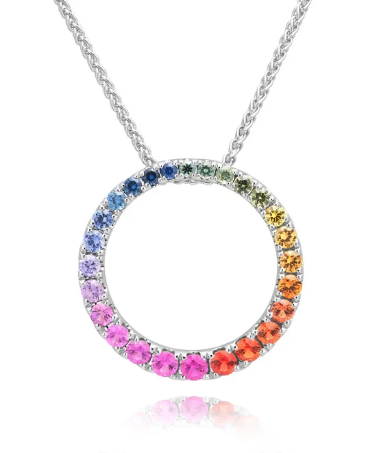 18ct white gold open circle pendant decorated with multi coloured sapphires (1.03ct).