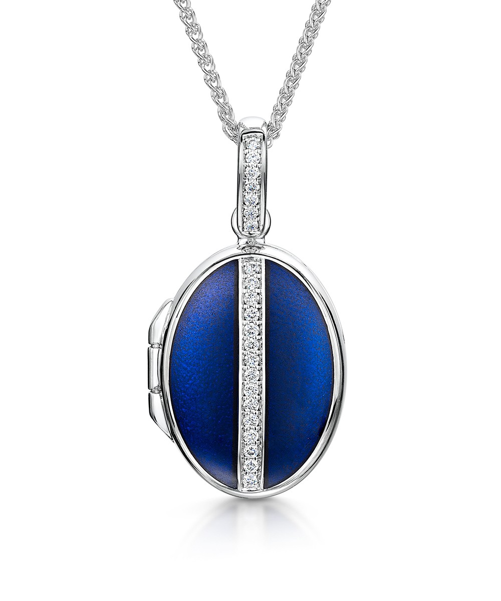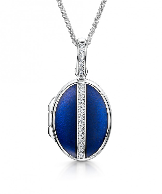 Our luxury 18 carat white gold 16mm x 13mm Oval Locket is pavé set with 22 x 0.005ct G/VS Round Brilliant diamonds, & features striking royal blue enamel.
