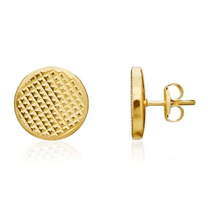 9ct yellow gold 10.5mm flat patterned disc stud earrings.