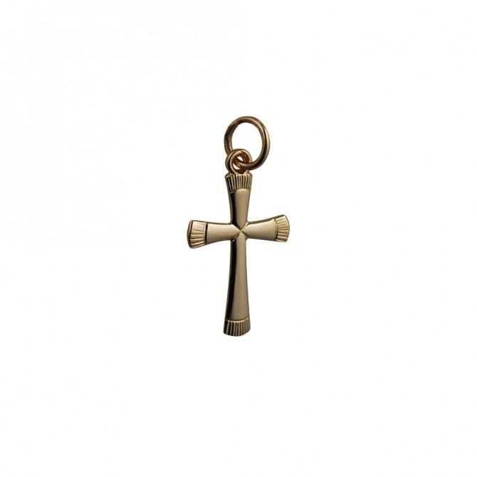 9ct yellow gold 19x13mm plain embossed Fancy shape Cross. Made and hand polished in Birmingham.