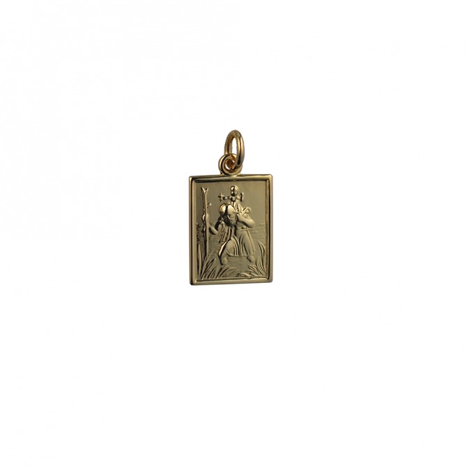 9ct yellow gold 19x14mm rectangular St Christopher Pendant. The back of this item is plain and ideal for engraving monograms, custom designs or simply a name, date or personalised message. Made and hand polished in Birmingham.