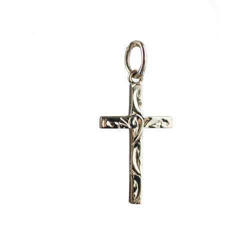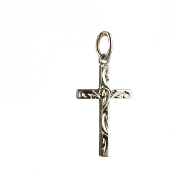 9ct yellow gold 20x12mm hand engraved solid block Cross, the front is covered in ornamental hand engraving. Handmade from 2 mm by 2 mm square wire, the back and sides are also plain highly polished. handmade and hand polished in Birmingham.
