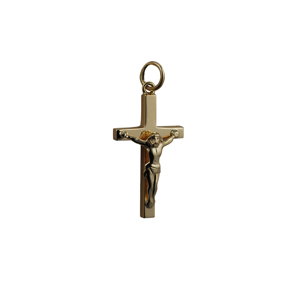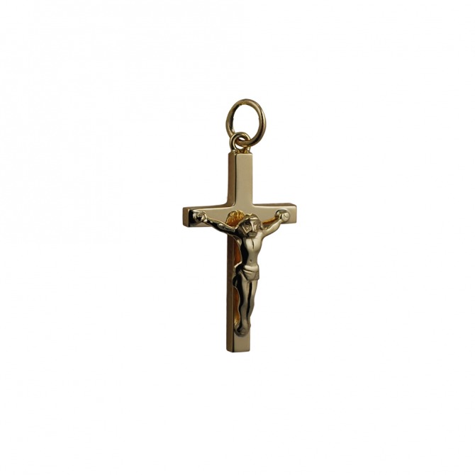 9ct yellow gold 25x15mm solid block Crucifix cross, the Corpus Christi is soldered onto the cross after the front has been highly polished. Handmade from 2.5 mm by 2.5 mm square wire, the back and sides are plain highly polished. Handmade and hand polished in our Birmingham factory. Please note due to the Handmade nature of this product weights, dimensions & measurements can slightly vary.
