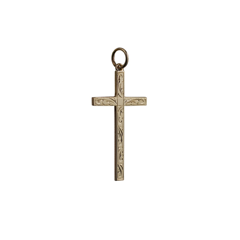 9ct yellow gold 30x17mm hand engraved solid block Cross, the front is covered in ornamental hand engraving. Handmade from 2.5 mm by 1.5 mm rectangular wire, the back and sides are also plain highly polished. Handmade and hand polished in our Birmingham factory. Please note due to the Handmade nature of this product weights, dimensions & measurements can slightly vary.