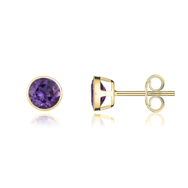 9ct yellow gold 5mm round rubover amethyst stud earrings.