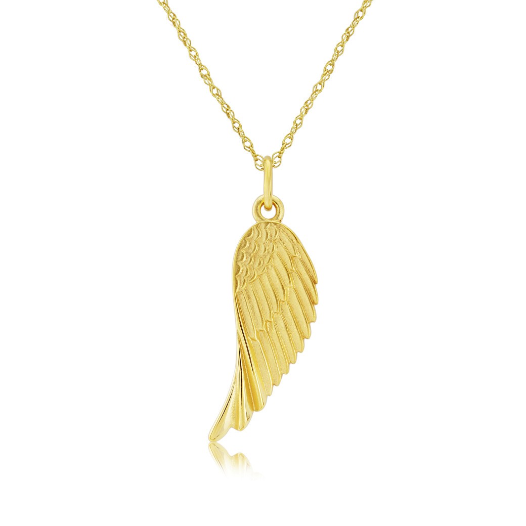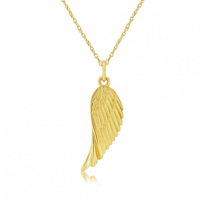 A single Angel wing charm in Yellow Gold with beautiful feathered detailing. Strung on an an 18" trace chain, this makes a special, meaningful gift, especially for old romantics and ethereal beings.