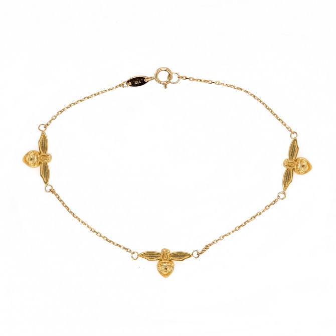 3 buzzing bee's perfectly balanced in 9ct Yellow Gold.Engraved detailing adds interest to the wings and body of these "beeautiful" insects.Supplied on a fixed delicate trace chain. Matching Necklace and earrings are also available.