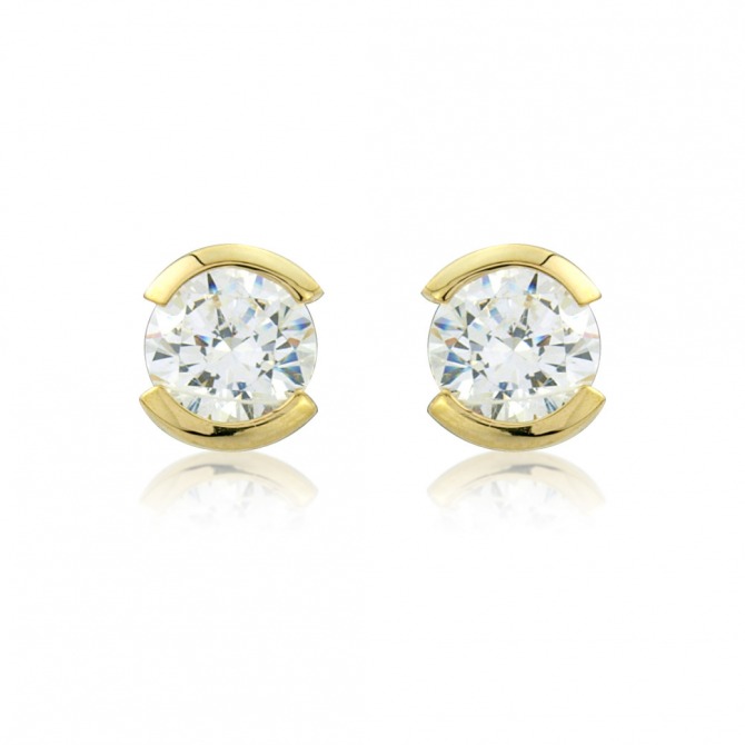 Stud earrings with a round, faceted Cubic Zirconia surrounded by two strips of nine carat Yellow Gold, enhancing the stone’s beauty. Affordable while elegant, these classic earrings are a beautiful gift and a wear-anywhere accessory.