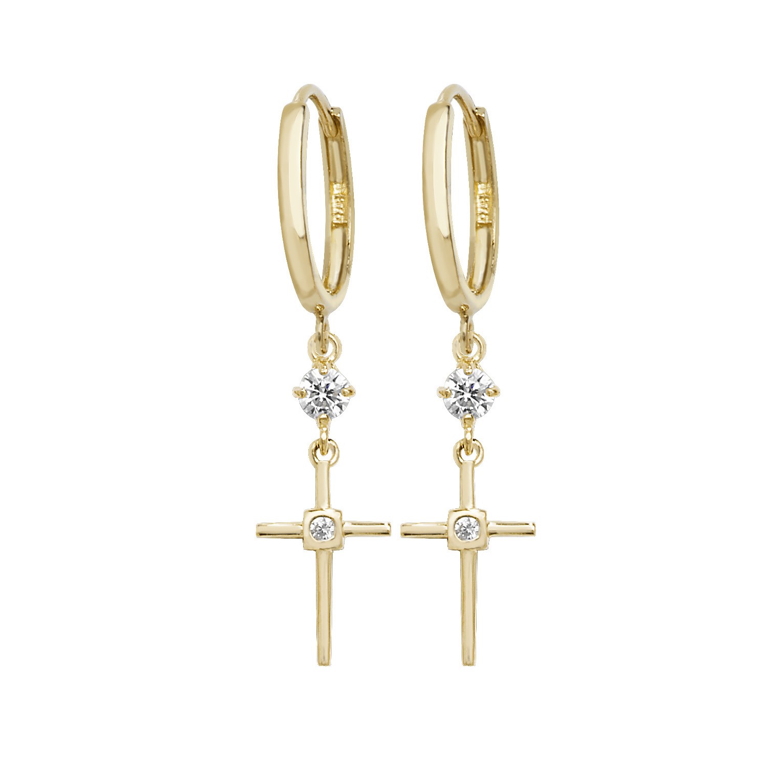 9ct yellow gold and cubic zirconia cross drop earrings.
