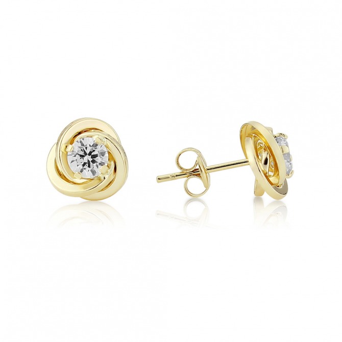 9ct yellow gold knot stud earrings set with cubic zirconia.