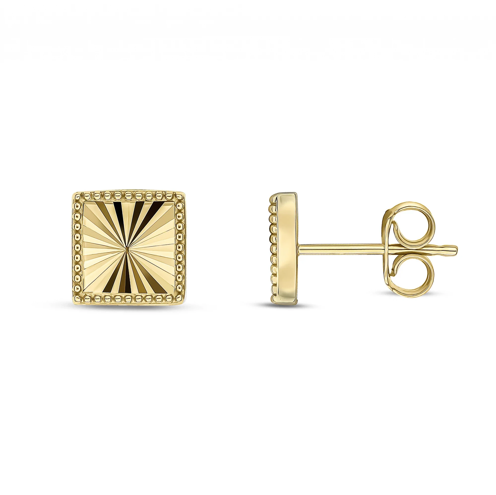 9ct yellow gold 7.8mm square stud earrings with a diamond cut finish and beaded edge.