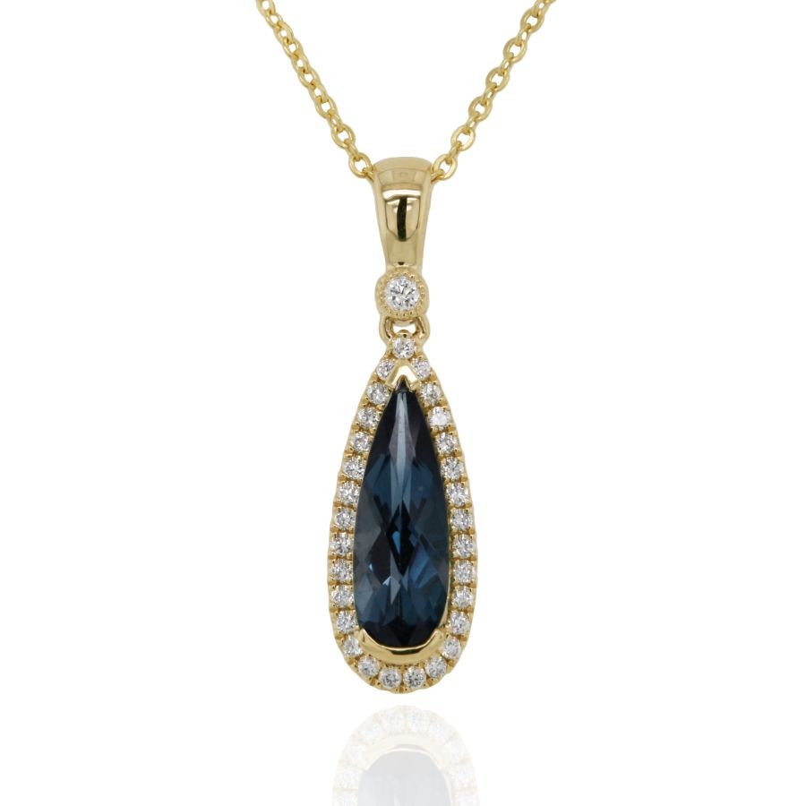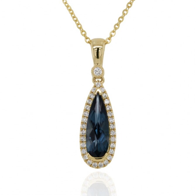 This classic Pear cut London Blue Topaz is surrounded by a Diamond set frame and bail. Made from 9ct Yellow Gold with a fine trace chain. The Necklace can be worn at 18 inches with an extra link option to adjust to 16 inches. A beautiful and feminine Pendant Necklace.