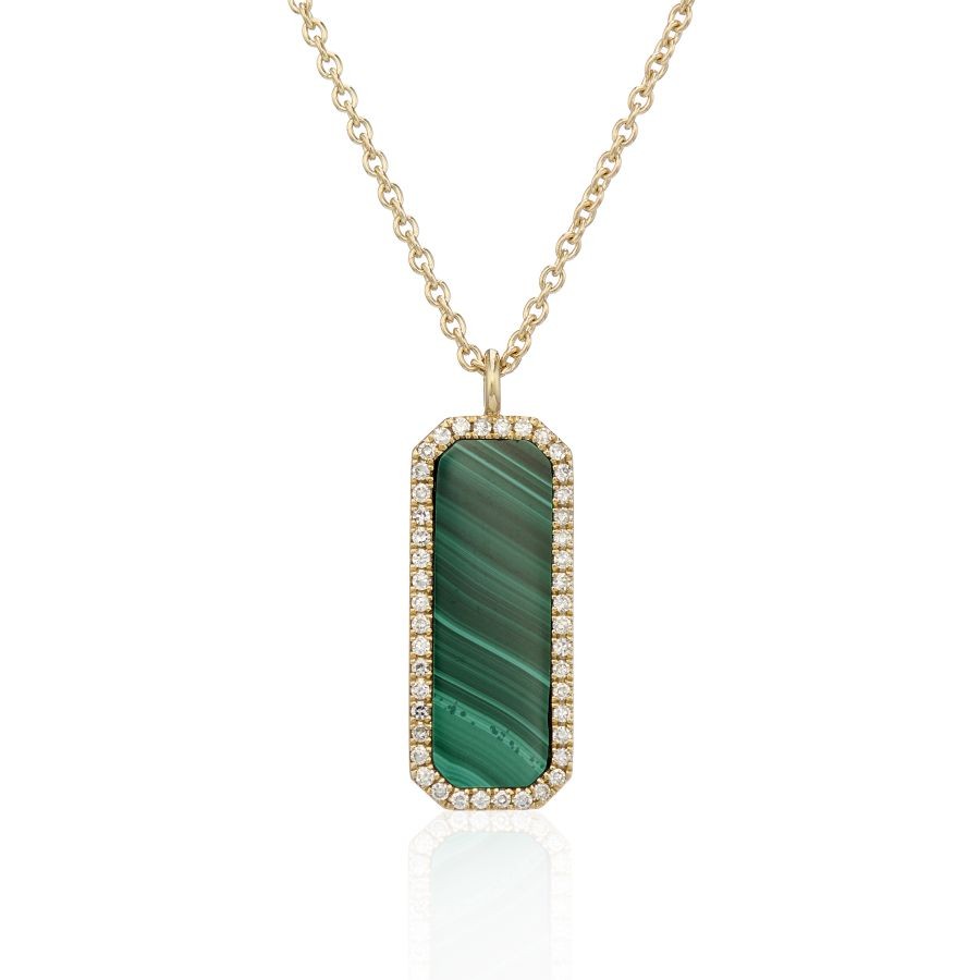 Elevate your style with this elegant charm necklace featuring a rectangular emerald-cut malachite gemstone set in polished yellow gold. The charm boasts a lush green hue with unique banding patterns, exuding natural beauty. This charm necklace will add a touch of sophistication to any ensemble.