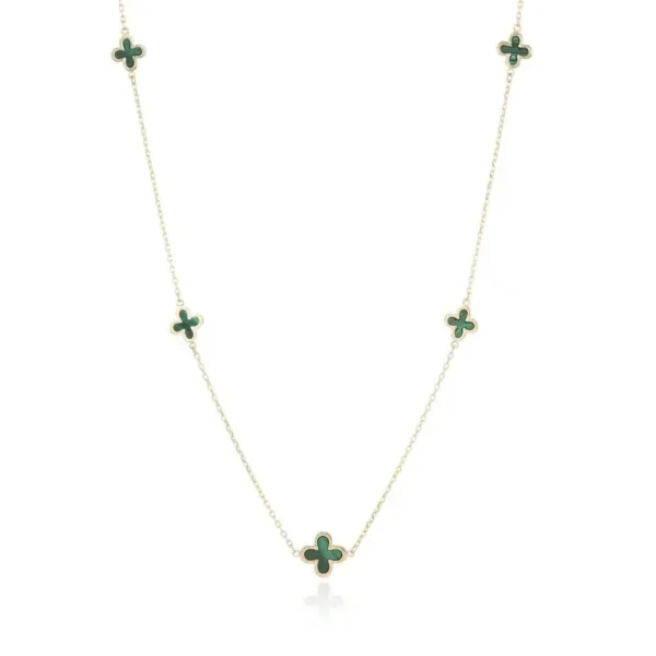 9ct Yellow Gold Necklace, dotted with Malachite stylised flowers. Each flower is surrounded by a gold bead effect adding an attractive and enhancing detail. This Necklace has a medium sized flower as it's centrepiece with a further 4 more smaller flowers, either side.