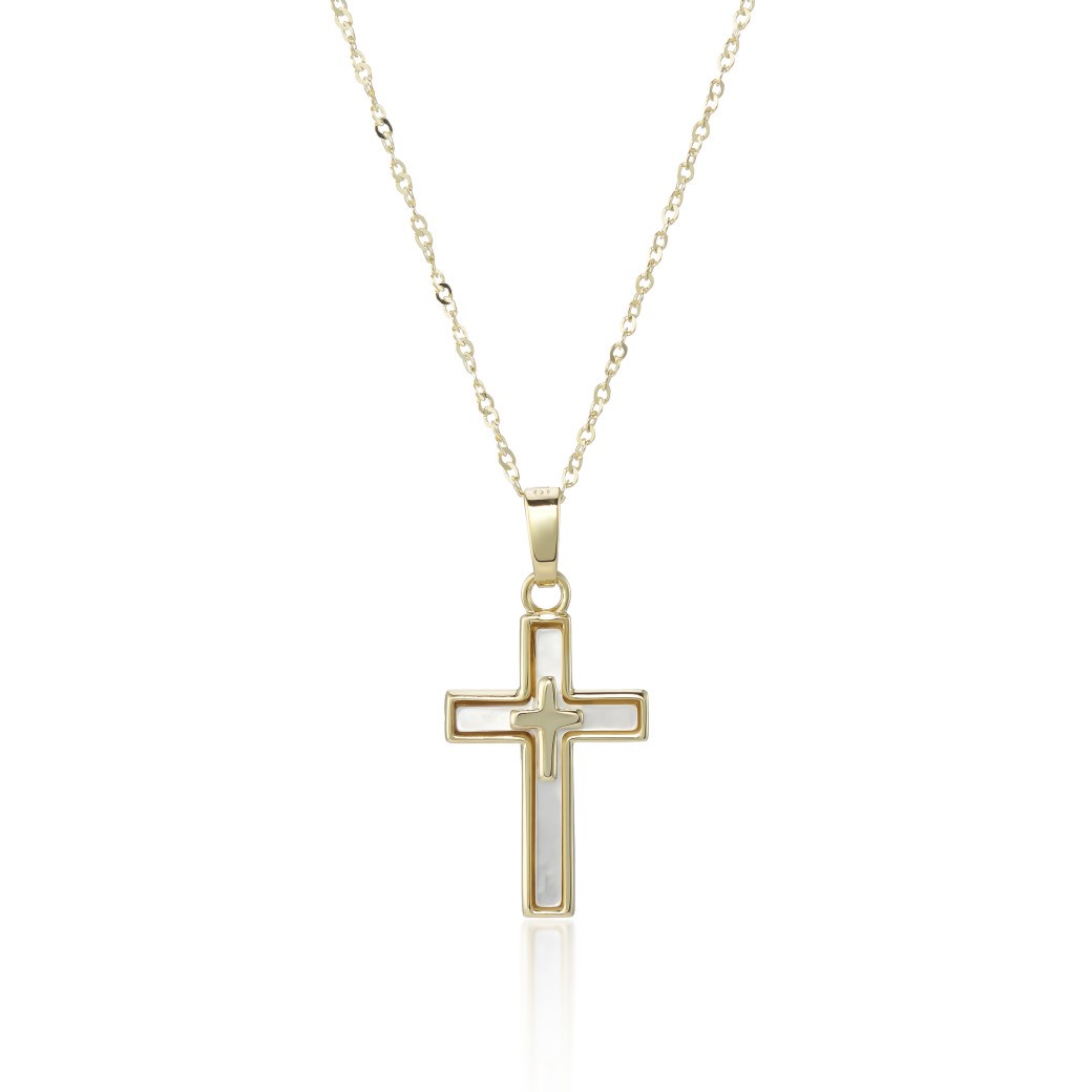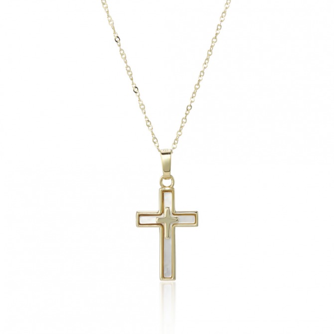 Elevate your style with this exquisite 9ct Yellow Gold Mother of Pearl Cross Pendant Necklace. This stunning piece features a delicate cross crafted from lustrous yellow gold, adorned with a shimmering mother of pearl inlay and an gold cross in miniature on top.