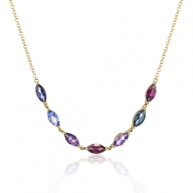 This exquisite necklace features a delicate gold chain adorned with an array of vibrant, multi-coloured gemstones including blue topaz, garnet, tanzanite and amethyst. Each gemstone is precisely cut to reflect light beautifully, adding a touch of elegance and sophistication to any outfit. Perfect for special occasions or as a standout piece in your jewelry collection.