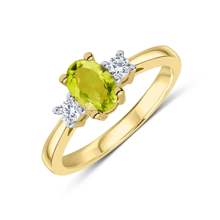 9ct yellow gold oval peridot and round diamond claw set stone ring.