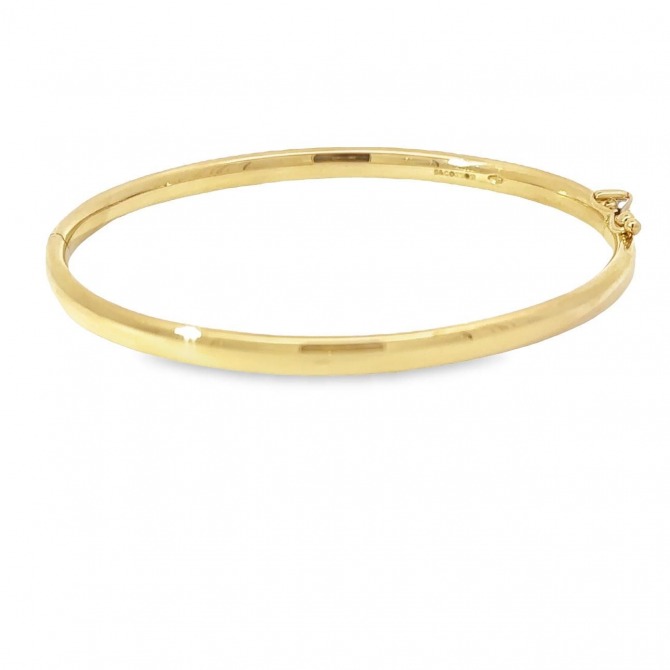 9ct yellow gold solid hinged bangle. Measures 6.5cm in diameter.