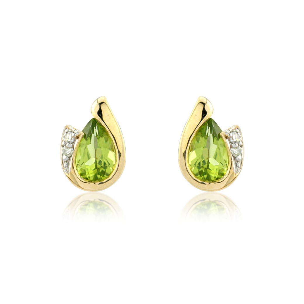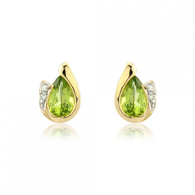 9ct Yellow Gold Diamond and Peridot Pear Stud Earrings. Two 6x4mm, 0.72ct pear Peridot's are wrapped sumptuously by yellow gold with 2 diamond highlights per pair. Peridot is the stone for the month of August and its qualities include fame, success, faithfulness and loyalty. Peridot is a Greek word meaning 'to give richness'. Post and Butterfly fittings. A suitable gift for Leo's and Virgo's.