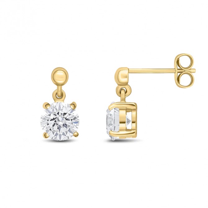 9ct yellow gold drop earrings with a claw set 6mm round cubic zirconia.