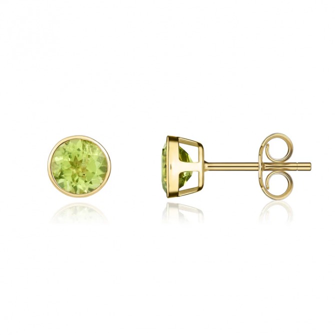 9ct yellow gold stud earrings rubover set with 5mm round peridot.