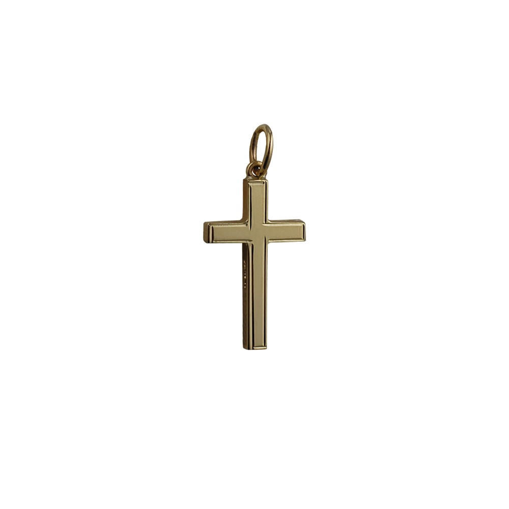 9ct yellow gold 20x13mm hand engraved line border solid block Cross. Handmade from 2.5 mm by 2.5 mm square wire, the back and sides are plain highly polished. Handmade and hand polished in the UK. Please note due to the Handmade nature of this product weights, dimensions & measurements can slightly vary.