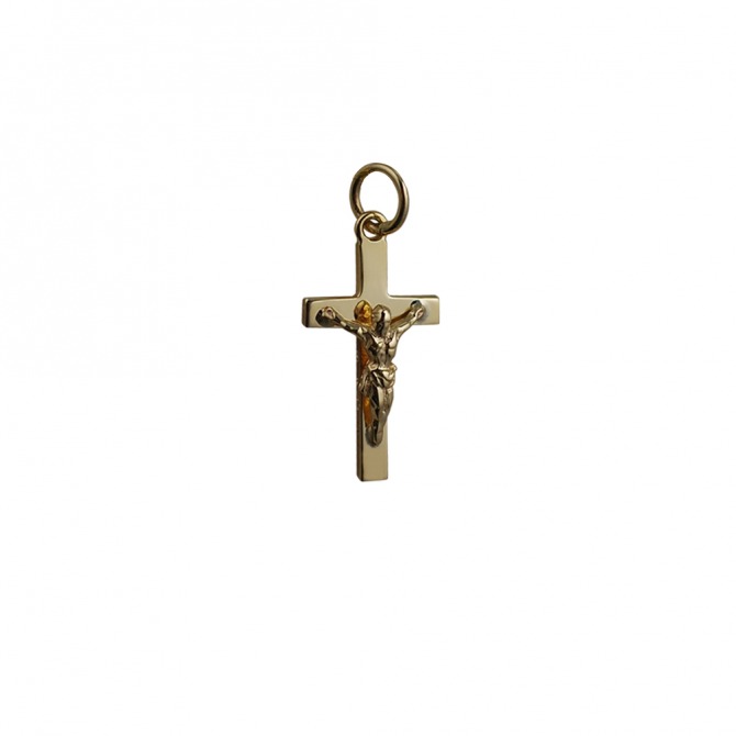 9ct yellow gold 20x12mm solid block Crucifix Cross, the Corpus Christi is soldered onto the cross after the front has been highly polished. Handmade in Birmingham from 2.5 mm by 1.5 mm rectangular wire, the back and sides are also plain highly polished. Produced in the UK. Please note this does not include a chain.