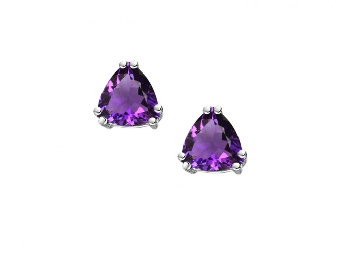 9ct white gold stud earrings set with trillion cut amethyst.