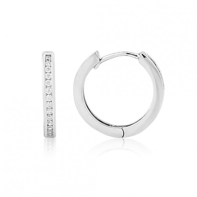 Classic, square-edged hoops are given a sparkling detail in these contemporary white Gold Earrings. Cubic Zirconia stones are set into the centre of the hoops and have a minimal channel setting to enhance the stones. The Earrings have an easy hinged fastening.