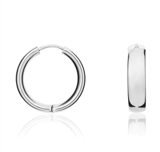 9ct white gold huggy hoops earrings with a polished finish. The measurements are 20mm by 2.5mm.