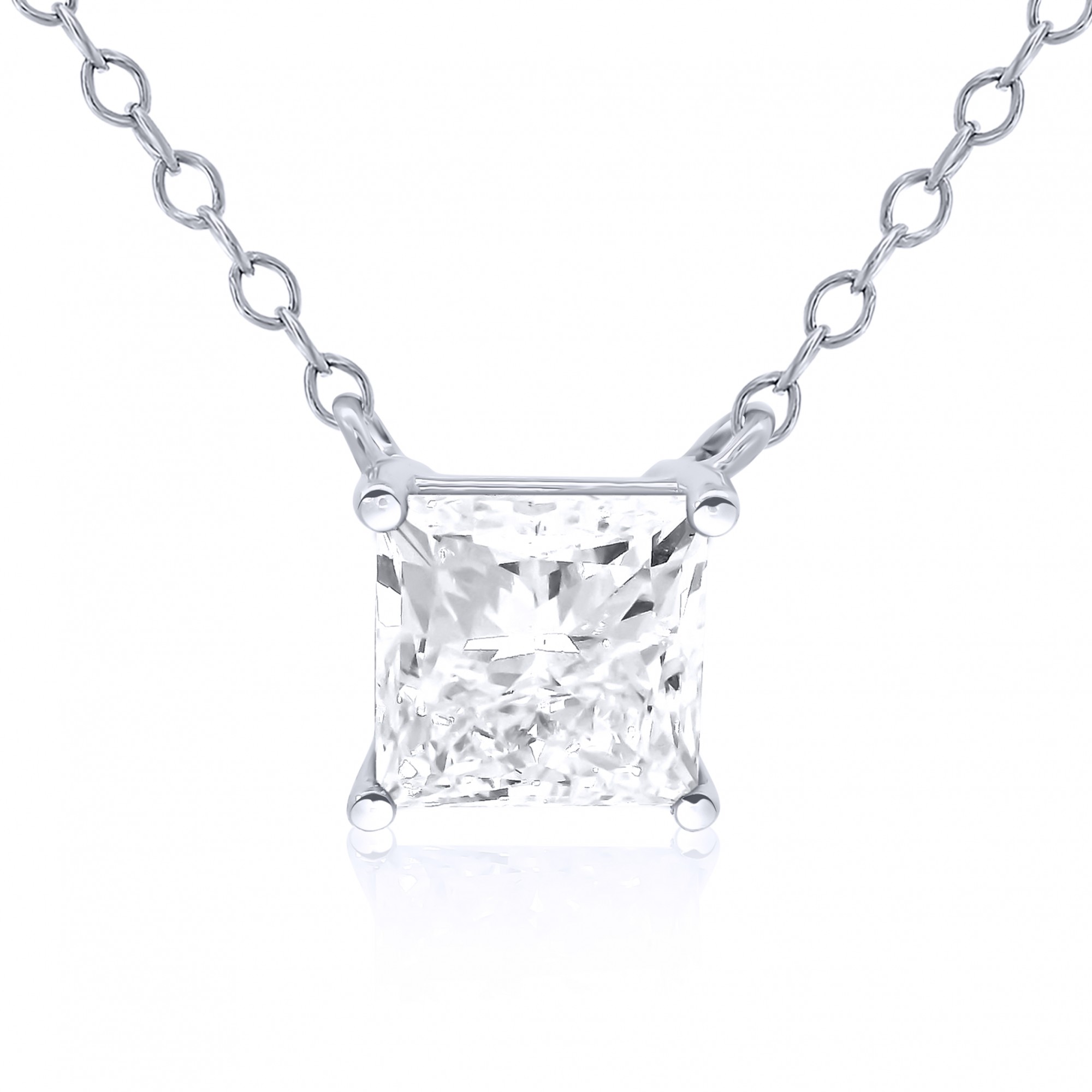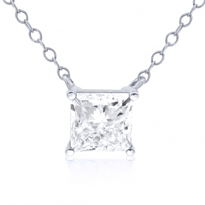 9ct white gold necklace with a claw set single princess cut lab grown diamond. D-E. VS1 1ct.