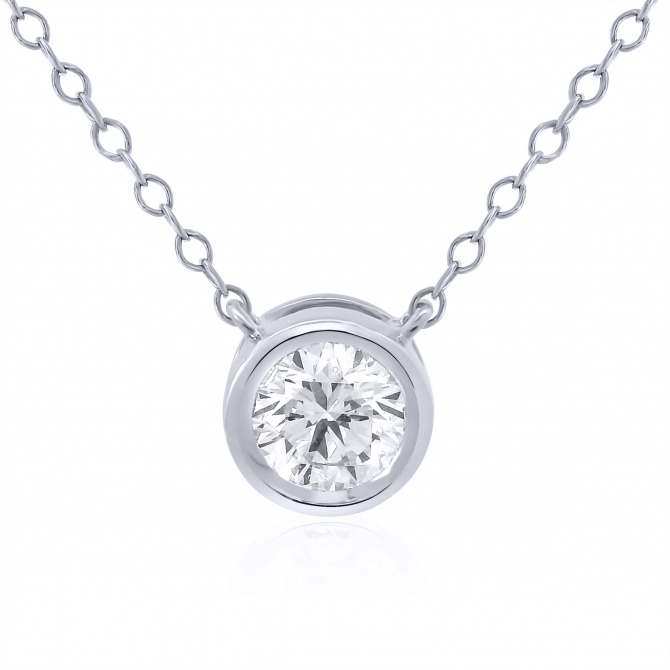 This stunning 9ct white gold pendant features a claw set round brilliant cut lab grown diamond in a bezel setting suspended from a 9ct gold trace chain. The perfect addition to any jewellery box. D-E. VS1. 0.50ct.