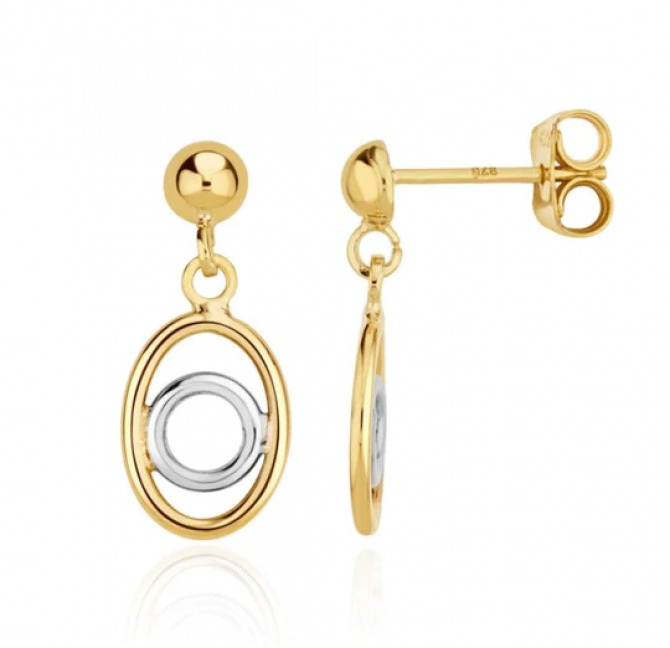 9ct two tone (white and yellow gold) drop earrings featuring an oval and round design drop.