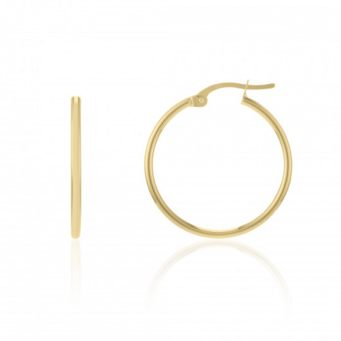 9ct yellow gold 20mm plain hoop earrings with a hinged fastener.