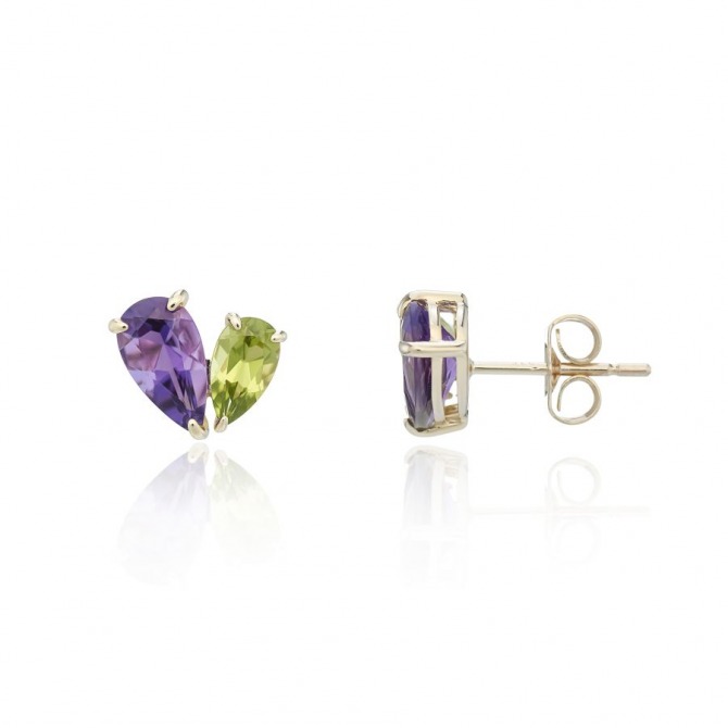 These dainty 9ct yellow gold stud earrings each showcase pear-shaped amethyst and peridot gemstones. The sparkling purple and light green hues add a touch of colour and sophistication to any ensemble. These earrings offer a blend of style and elegance, perfect for all occasions.