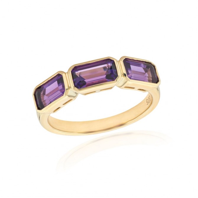 This stunning ring features three brilliant emerald cut amethysts set in a sleek, 9ct yellow gold polished band. Its contemporary design adds a touch of sophistication and luxury to any outfit, making it perfect for special occasions or everyday wear.