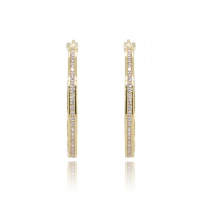 Classic, hoops are given a sparkling detail in these yellow Gold Earrings. Channel set Cubic Zirconia stones are set into the centre of the hoops and internally around the back. The Earrings have an easy hinged fastening.