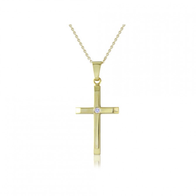 A classic, understated yet elegant gold cross pendant with delicate diamond in the centre. Thread on a fine gold chain measuring 16 inches but can be extended to 18 inches.