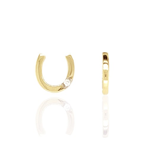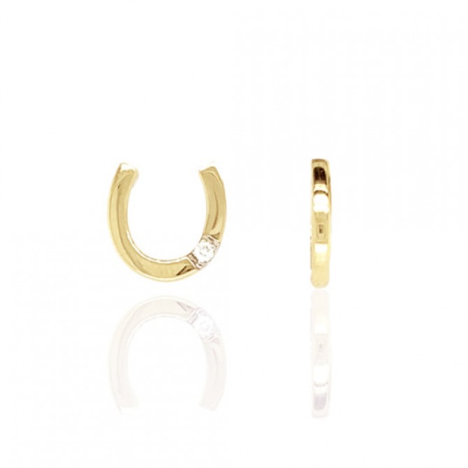 Modern ‘lucky’ 9ct yellow gold horseshoe earrings with diamond details. The horseshoe consists of one round brilliant diamond in each earring. The earrings are cute studs created in 9ct Yellow gold with post and butterfly fittings. According to superstition, horseshoes bring protection and luck, but whatever your belief, these earrings will look stunning in every setting.